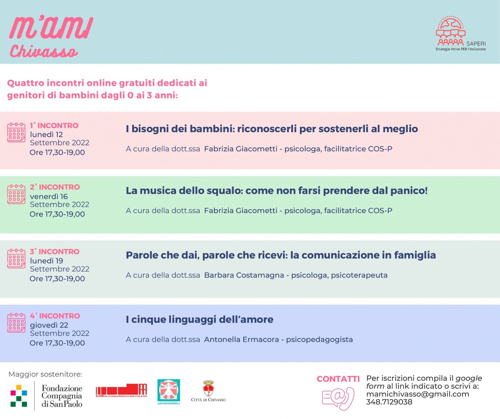 Nel corso del mese di settembre si svolgeranno 4 incontri online gratuiti, sui temi dei bisogni, delle emozioni e delle parole tra genitori e bimbi, con particolare riguardo ai bimbi da 0 a 3 anni.