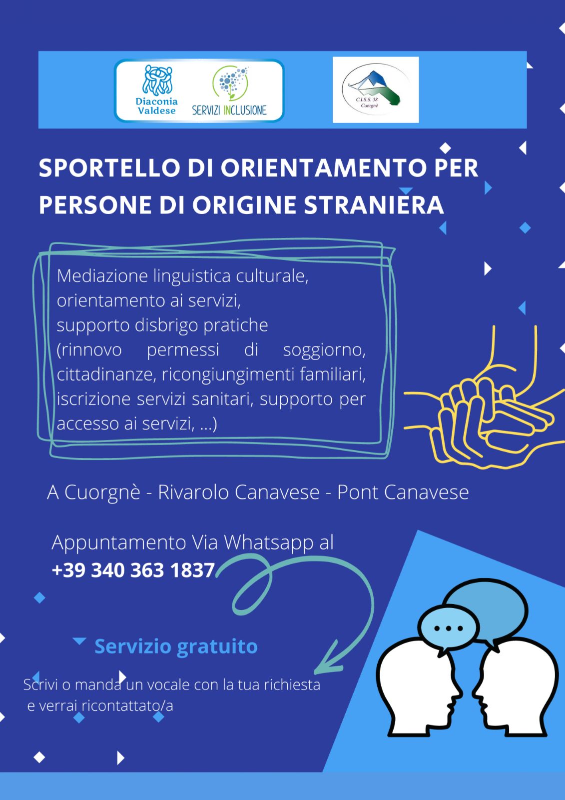 Si comunica che lo sportello di Mediazione Culturale, gestito da Diaconia Valdese, proseguirà la sua attività fino a dicembre 2022 nelle tre sedi disponibili Cuorgnè, Rivarolo C.se e Pont C.se .