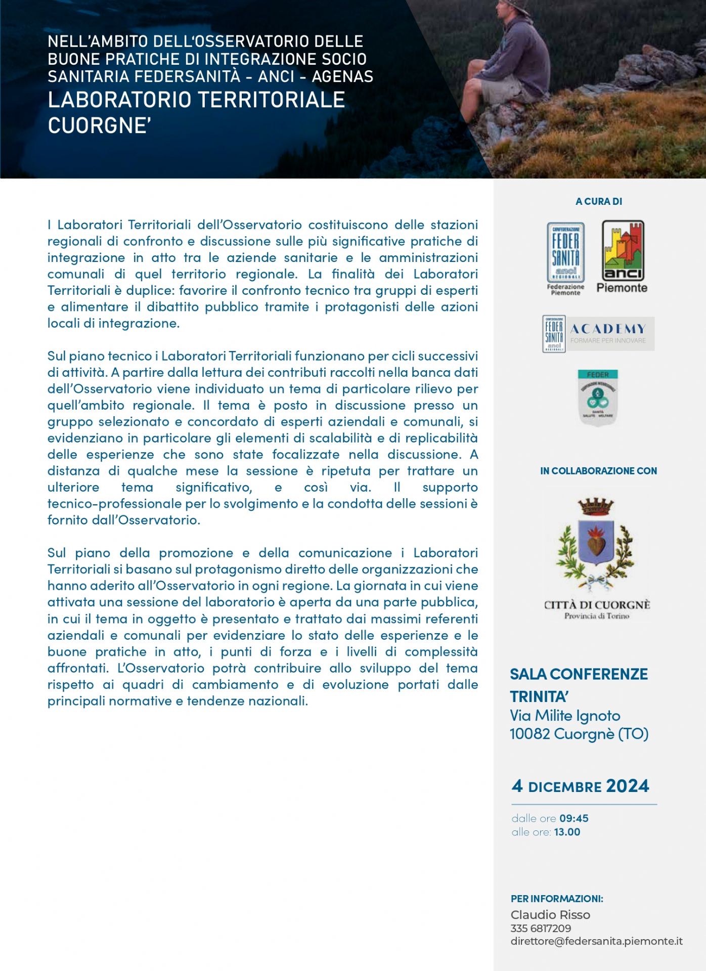 Iniziativa “Laboratorio Territoriale di Cuorgnè”, evento promosso da Federsanità e Anci, con il patrocinio del Comune di Cuorgnè, che si terrà MERCOLEDI 4 dicembre dalle 09.30 alle 13.00, presso la Sala Conferenze Trinità (via Milite Ignoto – Cuorgnè).