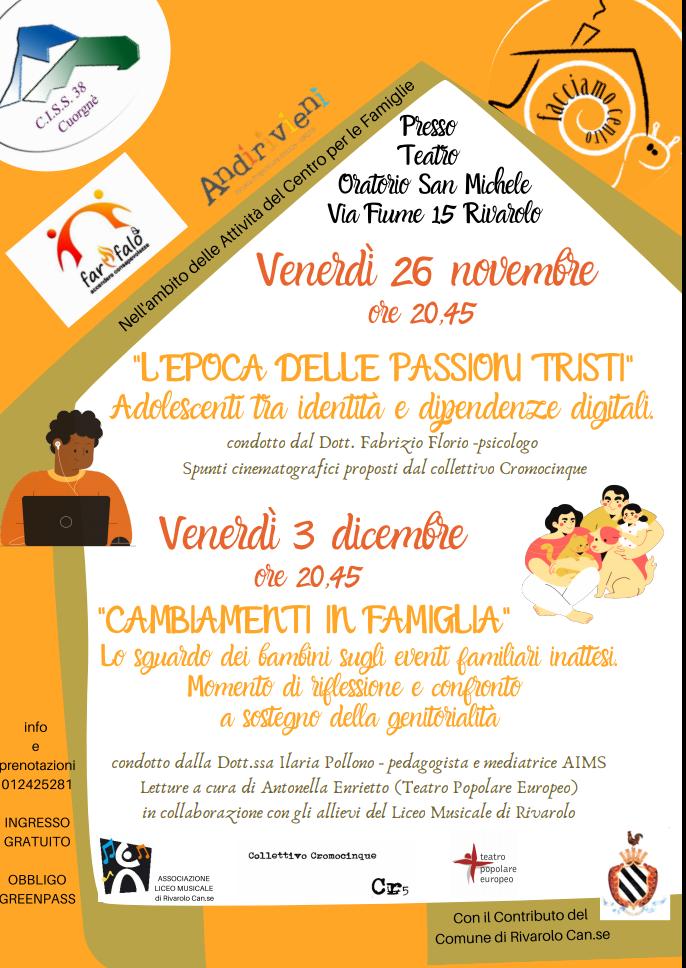Nell'ambito delle attività del Centro per le Famiglie due appuntamenti per i genitori, venerdì 26 novembre e venerdì 3 dicembre alle ore 20.45 all'oratorio San Michele, in via Fiume 15 a Rivarolo.