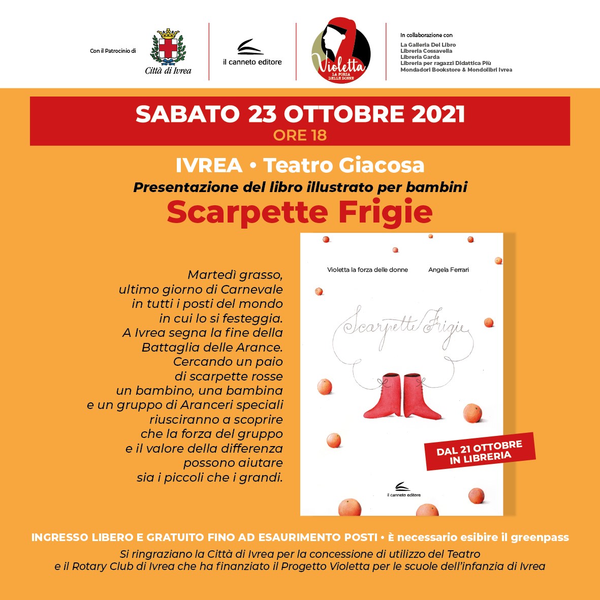 Sabato 23 ottobre al Teatro Giacosa di Ivrea si svolgerà la presentazione del libro illustrato per bambini "Scarpette frigie", nell'ambito del progetto 'Violetta. La forza delle donne', realizzato in collaborazione con il Rotary Club di Ivrea e la Città di Ivrea.
