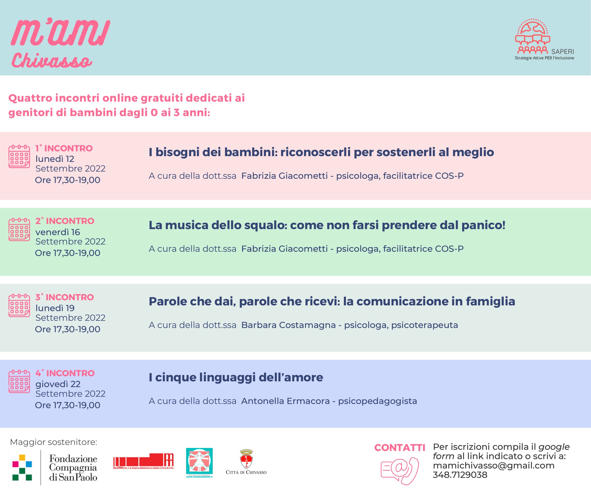 Gli appuntamenti si terranno in orario serale dalle 17.30 alle 19; per le iscrizioni è necessario scrivere a mamichivasso@gmail.com o telefonare al 348 7129038.
