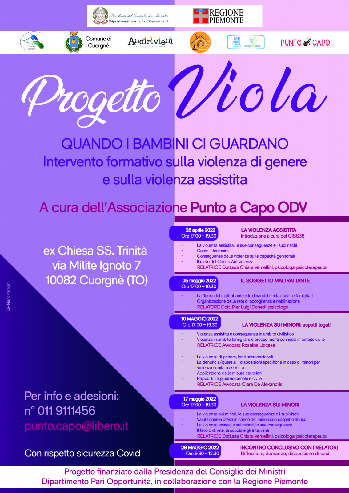 L'iniziativa organizzata a cura dell'Associazione Punto a Capo ODV si inserisce nell'ambito del Progetto Viola, finanziato dalla Presidenza del Consiglio dei Ministri Dipartimento Pari Opportunità, in collaborazione con la Regione Piemonte.