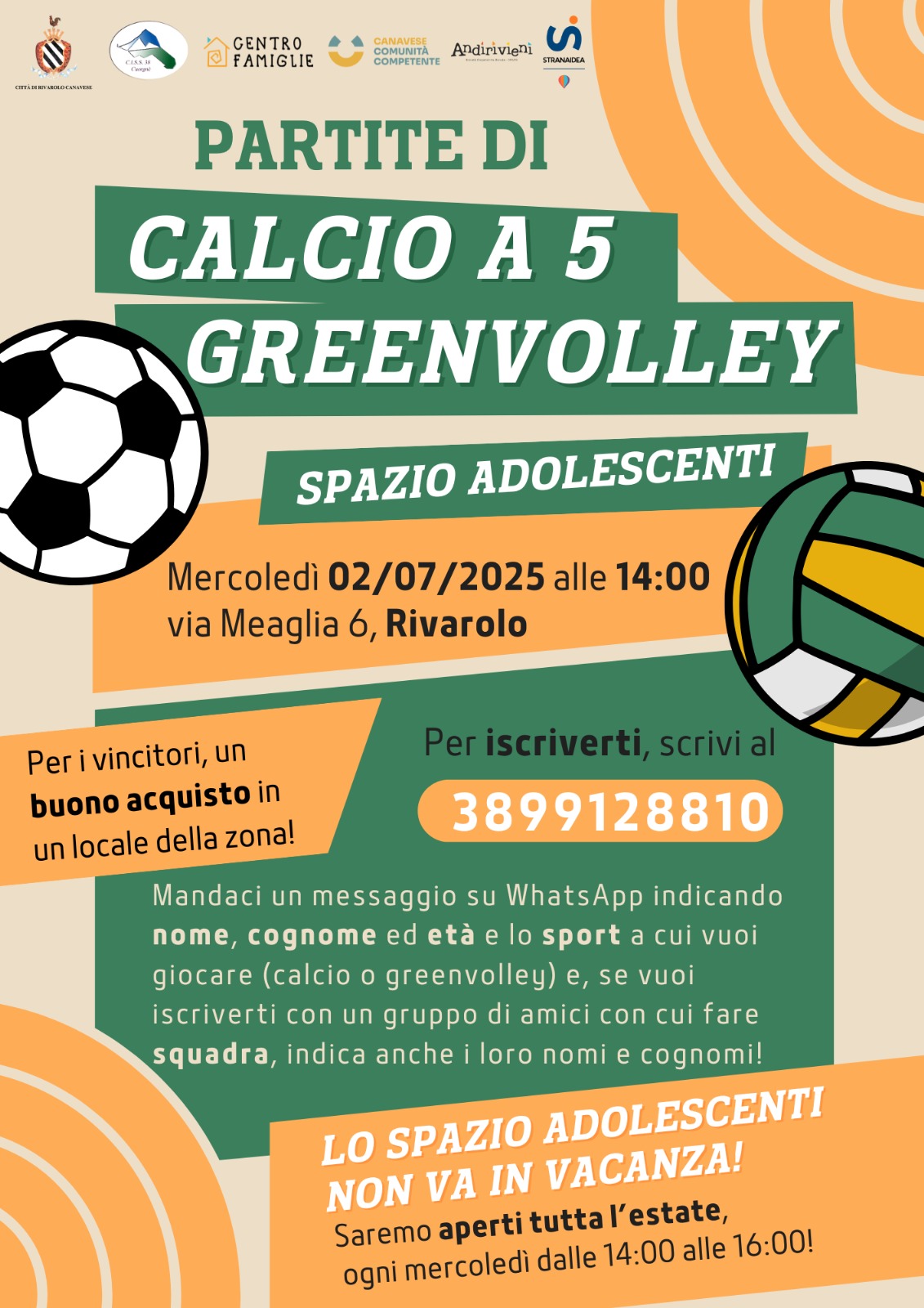 Mercoledì 2 luglio ti aspettiamo dalle 14:00 alle 16:00 per giocare a calcio a 5 e greenvolley allo Spazio Adolescenti di Rivarolo (Via Meaglia 6)!