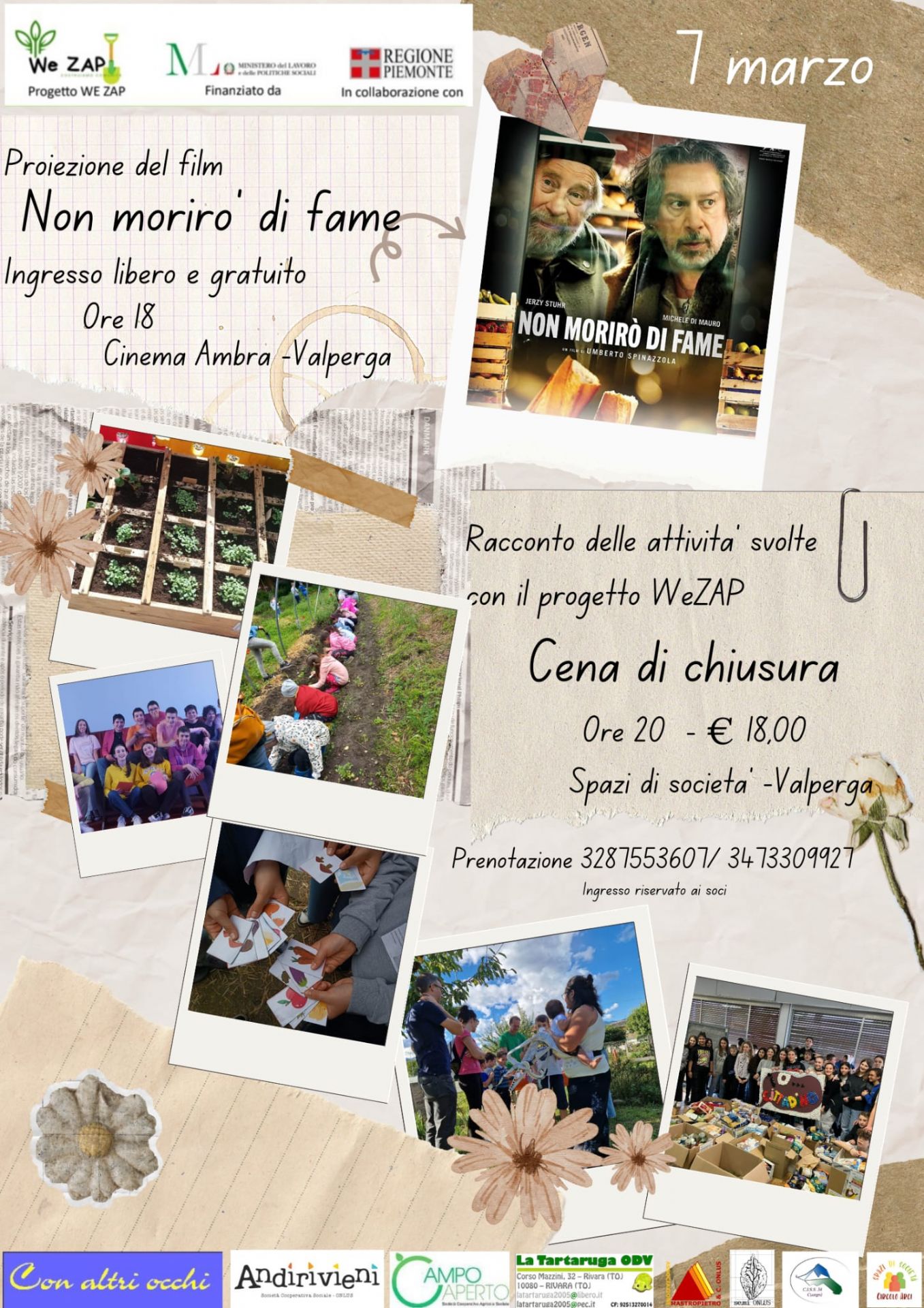 L’evento si aprirà con la proiezione gratuita del film "Non morirò di fame" al Cinema Ambra di Valperga alle ore 18:00. A seguire, alle ore 20:00, presso gli Spazi di Società di Valperga, si terrà la cena di chiusura per condividere esperienze e raccontare le attività svolte.