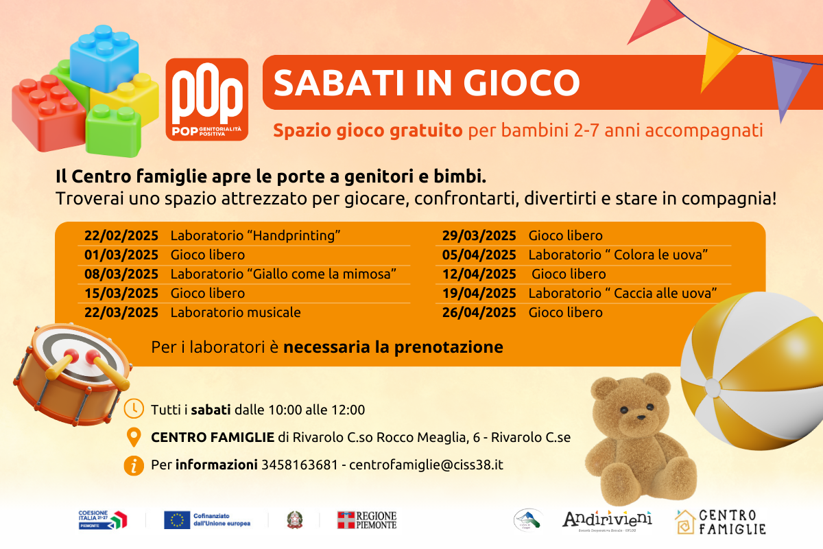 A partire dal 22 febbraio, ogni sabato mattina il Centro Famiglie di Rivarolo Canavese apre le porte a genitori e bambini dai 2 ai 7 anni accompagnati per un momento di gioco e socializzazione.